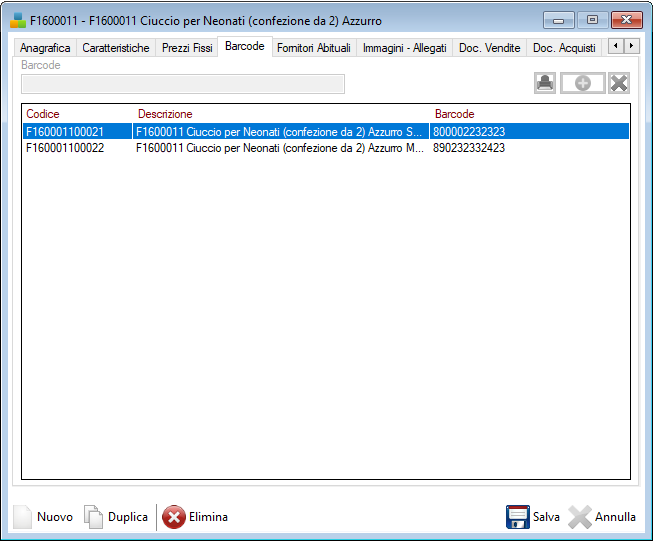 Prodotti Barcode E' possibile associare un articolo a più Barcode semplicemente posizionandosi sulla casella di testo Barcode e leggere con il lettore di codice a barre il codice riportato sul prodotto.