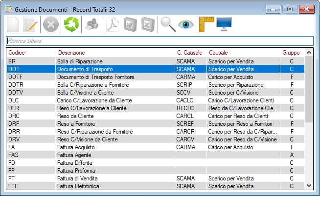 Per creare un documento basta andare sul menù Documenti> Gestione Documenti e scegliere il tipo di documento da creare (DDT, Fattura, Preventivo, ecc) eseguendo un doppio click sulla griglia della schermata di elenco.