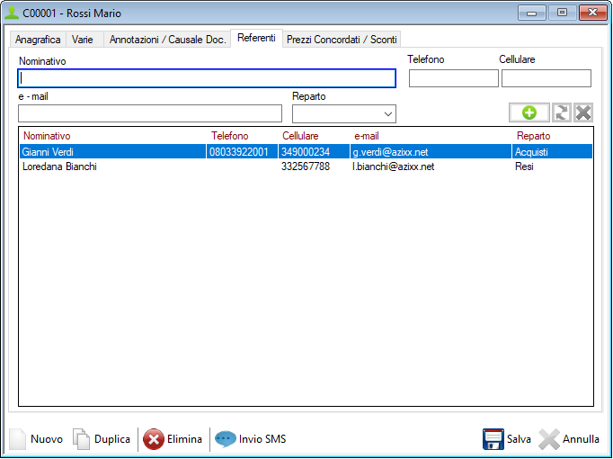 Qualora per un cliente o fornitore siano presenti più figure di riferimento (responsabile vendite, resi, supporto tecnico, ecc) è possibile aggiungerle intervenendo sul pulsante
