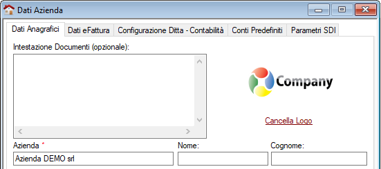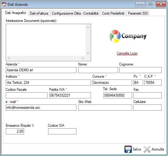 I dati dell'azienda vengono utilizzati per l'intestazione dei moduli di stampa e per altre operazioni richieste dal programma.