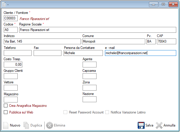 Dopo aver selezionato il cliente o fornitore è indispensabile identificare la destinazione con un codice, che verrà proposto in automatico dal sistema, e poi procedere con la compilazione dei vari dati anagrafici e eventualmente indicando anche il costo del trasporto.