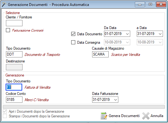 Tipo di Documento da generare - Codice Conto (opzionale)