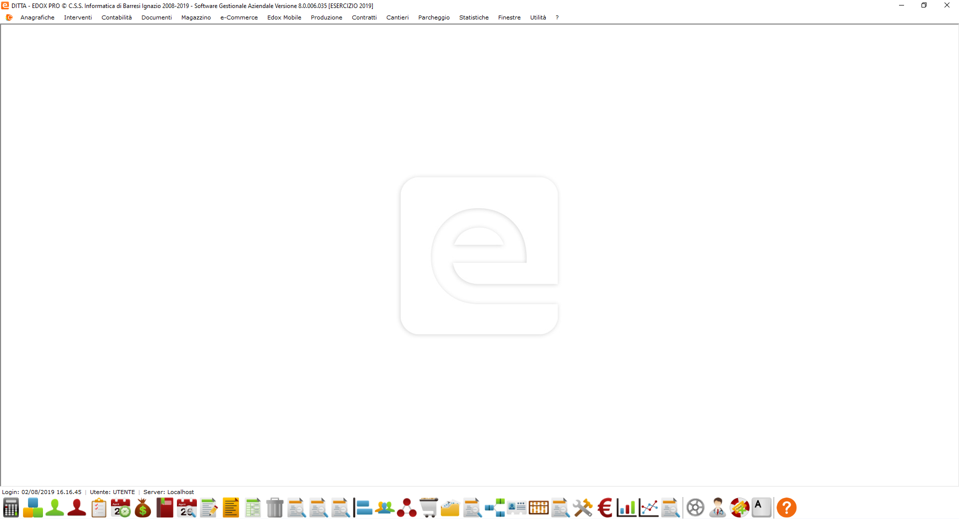 Il software si presenta come una finestra "contenitore" composta da un menù principale, dal quale si può accedere alle varie sezioni di Anagrafica, Documenti, Magazzino, Contabilità, ecc, e una barra di stato che visualizza le informazioni sull'utente che ha eseguito l'accesso e il server attualmente in uso.