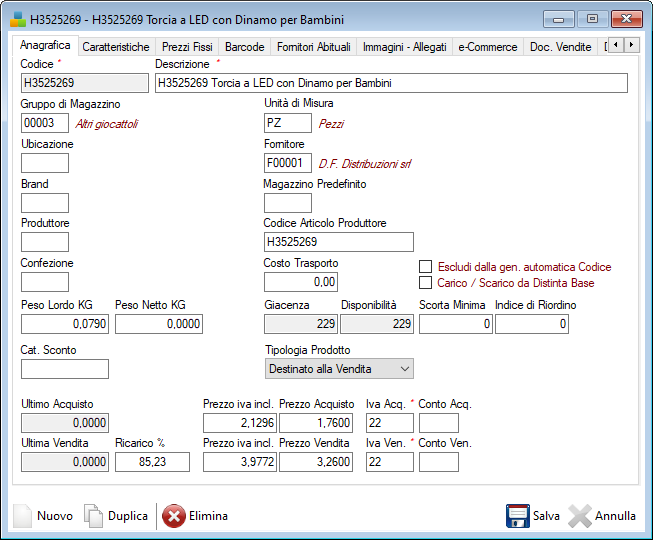 - Duplica: per la duplicazione della scheda corrente (ad es. Articolo, Cliente o Fornitore, ecc)