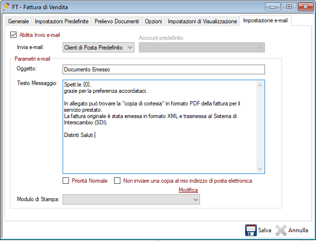 Permette l'invio del documento attraverso il client di posta predefinito installato nel computer o direttamente da Software Gestionale Edox utilizzando come oggetto e il testo del messaggio i valori inseriti nei rispettivi campi. ?Vedere anche: Configurazione account Posta Elettronica