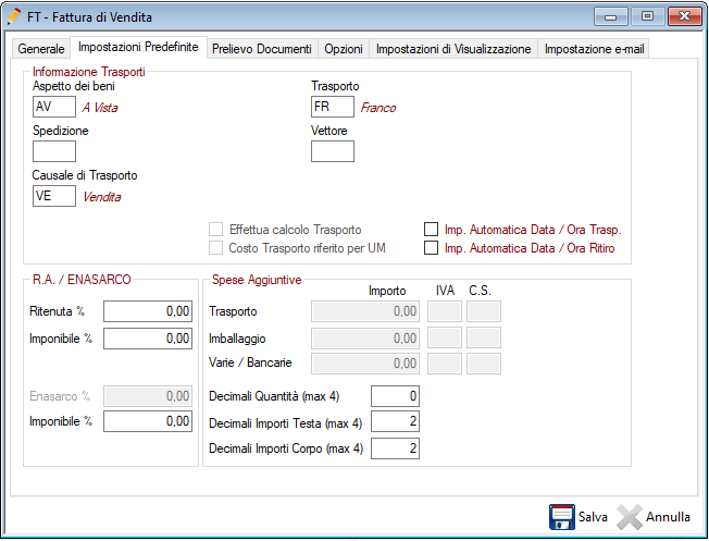 Definizione delle informazioni predefinite da caricare durante l'emissione / registrazione di un nuovo documento. (es. Tipo di Trasporto, Vettore, Causale di Trasporto, ecc.)