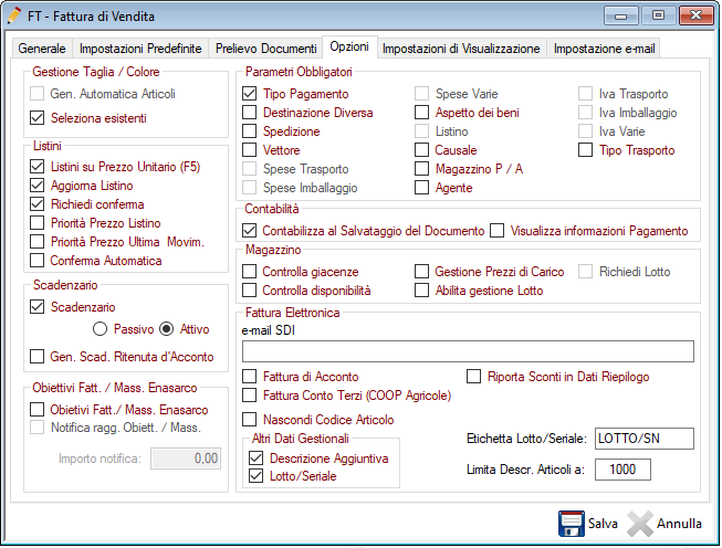 Se si vuole evitare di dimenticare qualche informazione durante l'emissione o registrazione di un documento, è possibile definire quali devono essere i parametri che devono essere necessariamente inseriti prima di effettuare il salvataggio.