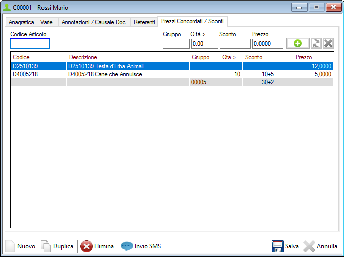 Per ogni articolo o gruppo di magazzino è possibile definire un prezzo fisso o uno sconto riservato. Per aggiungere un nuovo elemento basta cliccare sul pulsante