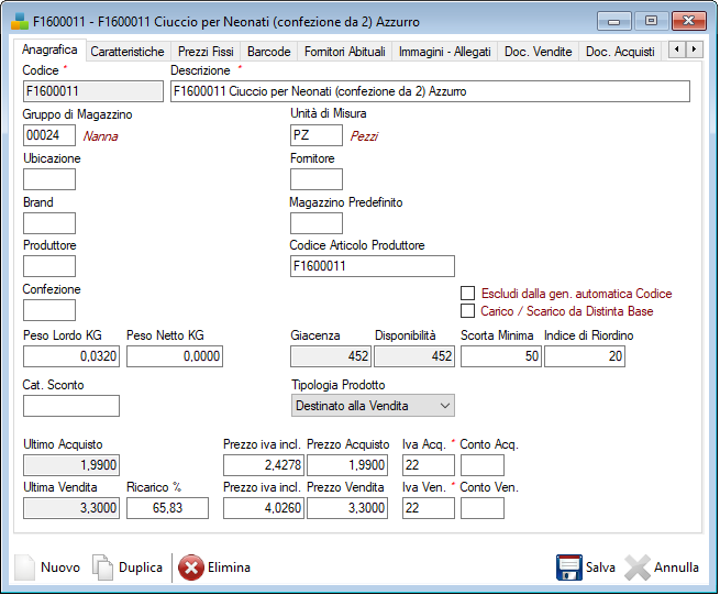In questa sezione andremo a definire tutte le informazioni anagrafiche del prodotto, come il codice, la descrizione e il gruppo di magazzino ed eventualmente associare un immagine e un file allegato (ad es. una scheda tecnica o un manuale).