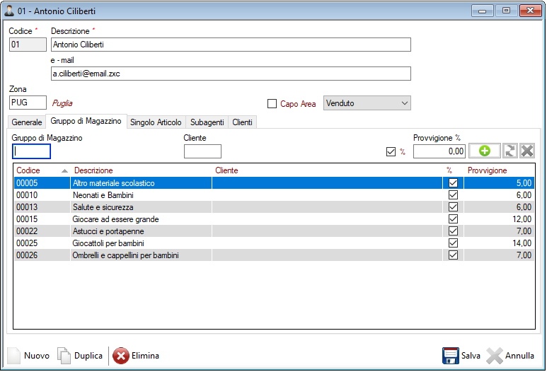 Oltre a poter definire le provvigioni sul Totale Merce è possibile definire le provvigioni per Gruppo di Magazzino. Selezionando il Gruppo di Magazzino, definendo il tipo di calcolo se fisso o percentuale e cliccando sul pulsante