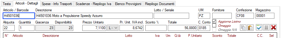 Le righe che compongono i documenti sono formate da i seguenti campi (alcuni campi sono attivabili da Impostazione Documenti):